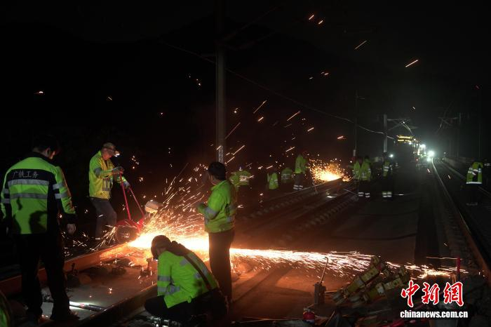 2月1日,国铁广州局广州南高铁工务段重点维修车间的工友正集结在京广高铁广州北至清远区段开展换轨作业。王玮 摄指令下达,数十名工友迅速行动,锯轨机、电动扳手齐上阵,清脆的金属碰撞声在夜色中接连响起。锯轨机的砂轮切触钢轨的瞬间,灼烧的金属碎屑骤然迸溅,如漫天星火洒落地面,化作绚烂的“打铁花”。与此同时,锯轨机两侧的工友握紧扳手,对准扣件精准拧动,500多根螺栓,不到10分钟便被全部拧出。