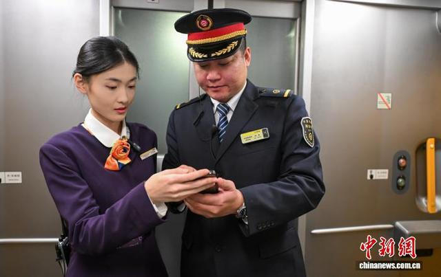 2月3日,农历腊月十六,正值春运第二天。在沈阳开往丹东的D7615次高铁列车上,中国铁路沈阳局集团有限公司大连客运段动车三队丹大五组执乘该列车。图为列车长闫冬(右)与工作人员沟通工作。 中新社记者 于海洋 摄