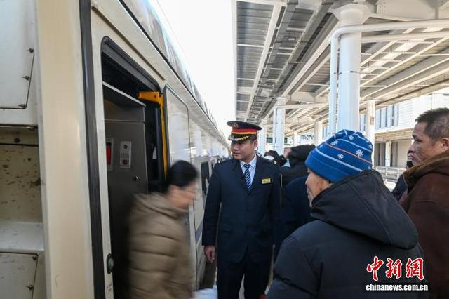 2月3日,农历腊月十六,正值春运第二天。在沈阳开往丹东的D7615次高铁列车上,中国铁路沈阳局集团有限公司大连客运段动车三队丹大五组执乘该列车。图为列车长闫冬在车前立岗。 中新社记者 于海洋 摄