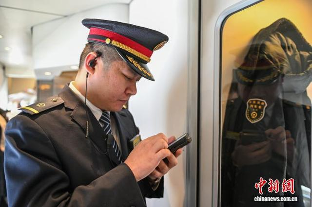 2月3日,农历腊月十六,正值春运第二天。在沈阳开往丹东的D7615次高铁列车上,中国铁路沈阳局集团有限公司大连客运段动车三队丹大五组执乘该列车。图为列车长闫冬在用手持终端机查看客流信息。 中新社记者 于海洋 摄