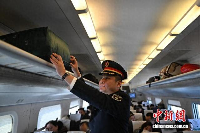 2月3日,农历腊月十六,正值春运第二天。在沈阳开往丹东的D7615次高铁列车上,中国铁路沈阳局集团有限公司大连客运段动车三队丹大五组执乘该列车。图为列车长闫冬整理车厢行李。 中新社记者 于海洋 摄