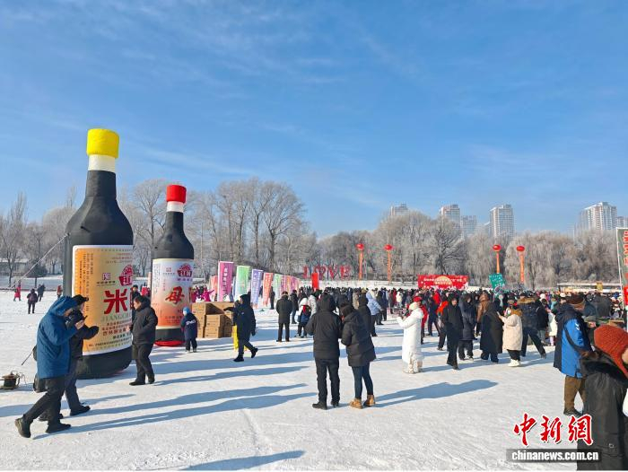 瓶装酱油、米醋造型的巨型气球吸引游客打卡。 石洪宇 摄实际上,上述场景也是吉林非遗技艺、老字号企业借势冰雪热潮向前发展的缩影。新雪季以来,作为中国冰雪旅游重镇的吉林市热度爆棚,成为老字号出圈的绝佳契机。