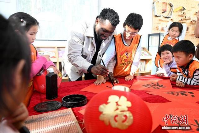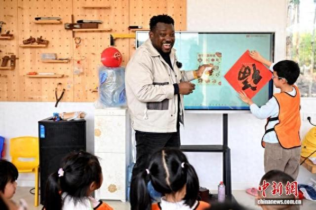 “‘福’代表好运和幸福,我喜欢这个字蕴含的意义。”他一边写一边向孩子们解释。他铺开红纸,握起毛笔,和孩子们一起写“福”“马”“春”等字,虽然笔触略显生涩,但态度格外专注。孩子们也兴奋地围上来参与其中,中外师生共同完成了一幅幅充满童趣的“福”字作品。