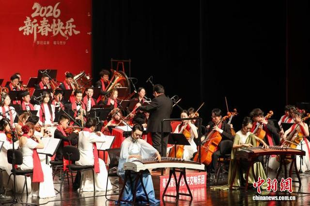 2月4日晚,“2026青海新春交响音乐会”在省会西宁上演。图为古筝与乐队合奏陕北民歌《山丹丹花开红艳艳》。中新社记者 马铭言 摄