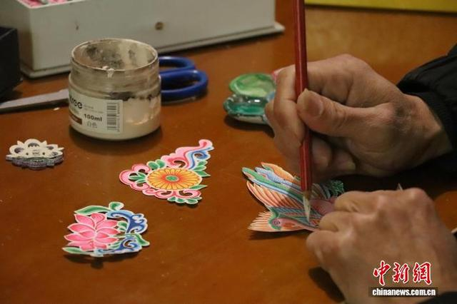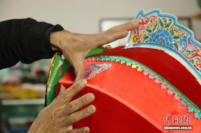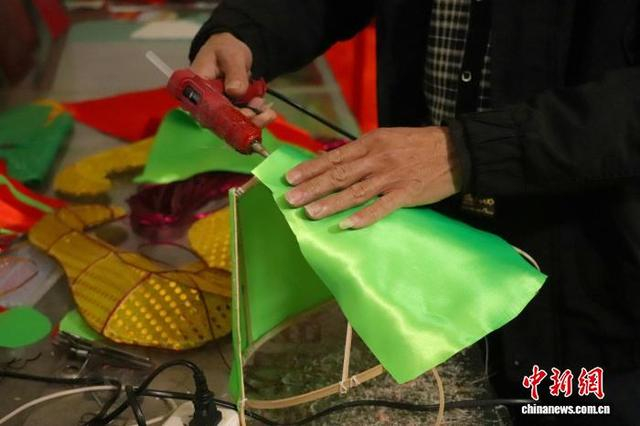 傅声谱正在画鲤鱼灯上的装饰贴纸。 熊锦阳 摄