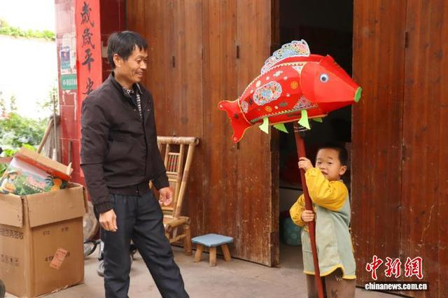 傅声谱的孙子正在玩刚制作好的鲤鱼灯。 熊锦阳 摄