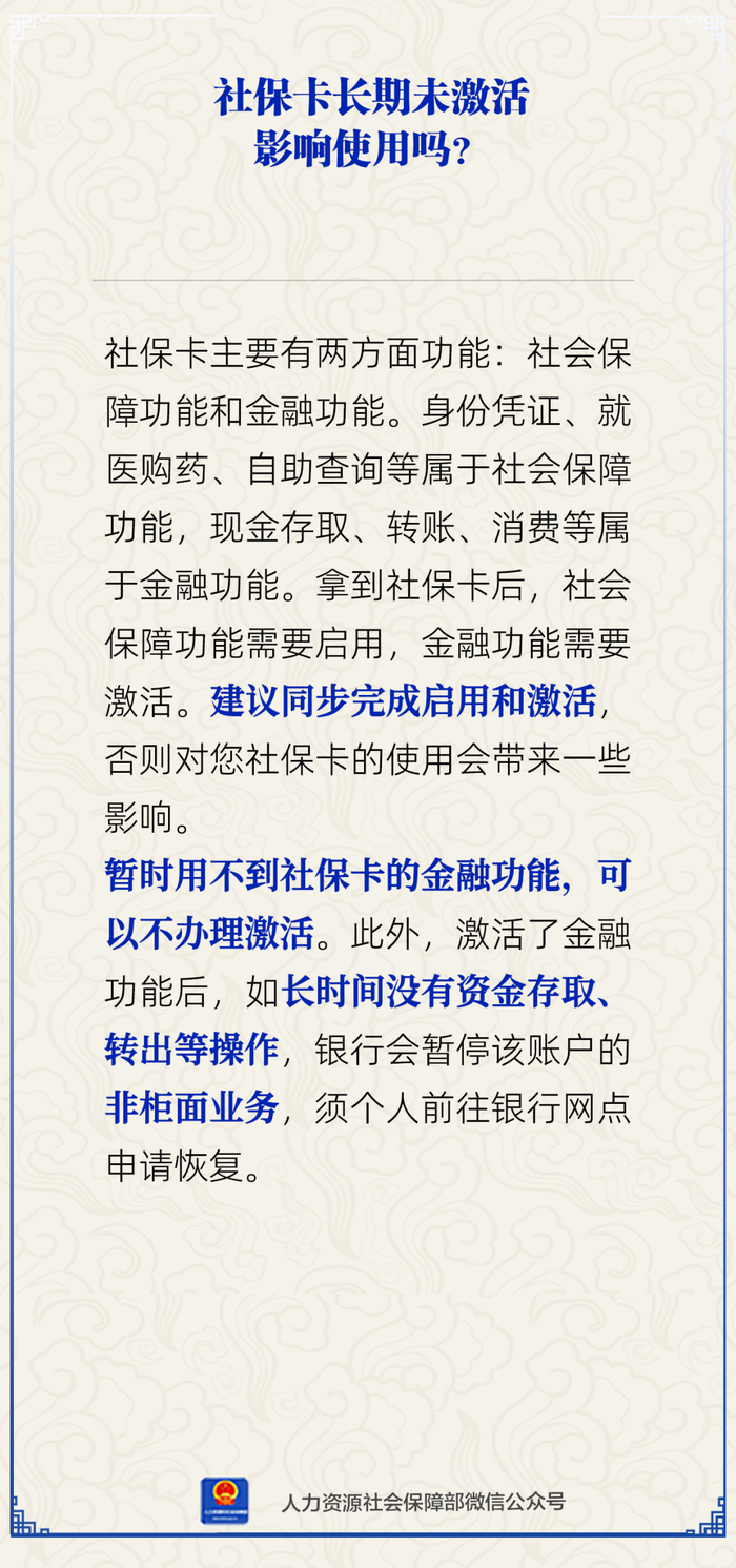 暂时用不到社保卡的金融功能,可以不办理激活。此外,激活了金融功能后,如长时间没有资金存取、转出等操作,银行会暂停该账户的非柜面业务,须个人前往银行网点申请恢复。