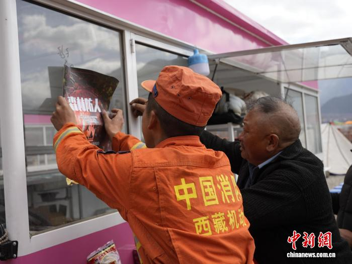 图为给商铺宣传防火知识。 丹增平措 摄当前正值西藏冬春森林草原防火紧要期,干燥多风的气候加之转山活动“早起、集中、沿线分散”的特点,给防火工作带来不小挑战。中队科学研判后,采取“固定站点+流动巡护”的立体化防控模式:在步道入口、休憩点及煨桑台等关键区域设置临时宣传服务站,同时组建流动宣传分队沿转山路径动态巡护,实现防火提醒全覆盖。