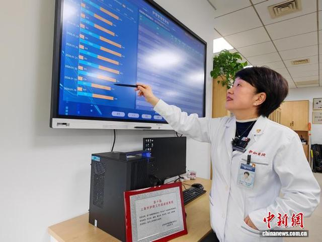 张玉侠为记者讲解“护理管理驾驶舱”显示的相关信息。中新网记者 陈静 摄在该院护理部,记者看到了一块大屏——护理管理驾驶舱,上面清晰标注了免陪照护病区的具体情况,免陪照护服务月统计信息等内容。各个病区免陪照护服务的情况一目了然。