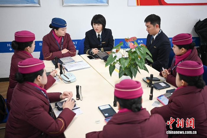 2026年春运,是重庆航空女安全员邓莉娜参加工作的第20个春运。自2006年入职以来,她已累计安全飞行超过1.28万小时,在万米高空守护一次次平安起落。出生在新疆生产建设兵团、警校毕业的邓莉娜于2006年加入中国南方航空新疆分公司,成为南航首位女性安全员;2025年,又与同为安全员的丈夫调至南航旗下重庆航空,继续坚守飞行一线。作为一名在客机上执行安全保卫任务的航空安全员,她与男队员接受同强度训练,在看似平常的航程中始终保持高度警觉。“对我们航空安全员来说,春运意味着航班更多、任务更重、责任也更大。今年大概率还是不能在家团圆,但能和旅客、同事一起在岗位上过年,我觉得同样有意义。”作为重庆航空唯一的“双安全员家庭”,她与丈夫常年错开飞行周期,只为让孩子身边始终有人陪伴。“把每一趟航班守护好,让每一位旅客平安回家、团圆,就是我们在春运里最大的心愿。”邓莉娜说。图为2月5日,重庆航空生产基地,邓莉娜(左四)和机组人员开飞行准备会。中新社记者 何蓬磊 摄