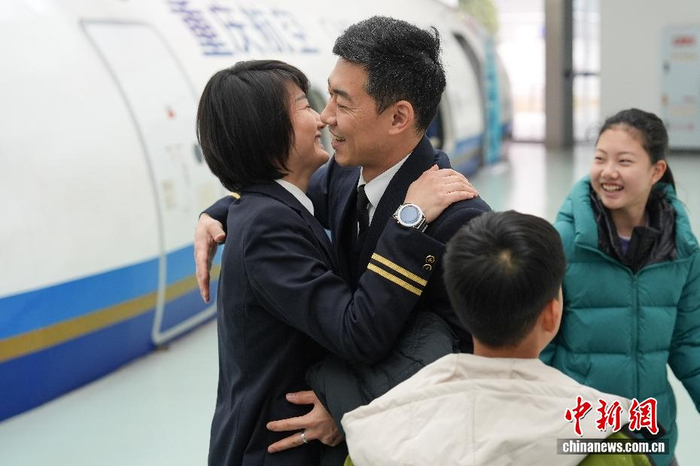 2026年春运,是重庆航空女安全员邓莉娜参加工作的第20个春运。自2006年入职以来,她已累计安全飞行超过1.28万小时,在万米高空守护一次次平安起落。出生在新疆生产建设兵团、警校毕业的邓莉娜于2006年加入中国南方航空新疆分公司,成为南航首位女性安全员;2025年,又与同为安全员的丈夫调至南航旗下重庆航空,继续坚守飞行一线。作为一名在客机上执行安全保卫任务的航空安全员,她与男队员接受同强度训练,在看似平常的航程中始终保持高度警觉。“对我们航空安全员来说,春运意味着航班更多、任务更重、责任也更大。今年大概率还是不能在家团圆,但能和旅客、同事一起在岗位上过年,我觉得同样有意义。”作为重庆航空唯一的“双安全员家庭”,她与丈夫常年错开飞行周期,只为让孩子身边始终有人陪伴。“把每一趟航班守护好,让每一位旅客平安回家、团圆,就是我们在春运里最大的心愿。”邓莉娜说。图为2月5日,重庆航空生产基地,邓莉娜(左一)在执飞前与丈夫鲜明拥抱道别。中新社记者 何蓬磊 摄