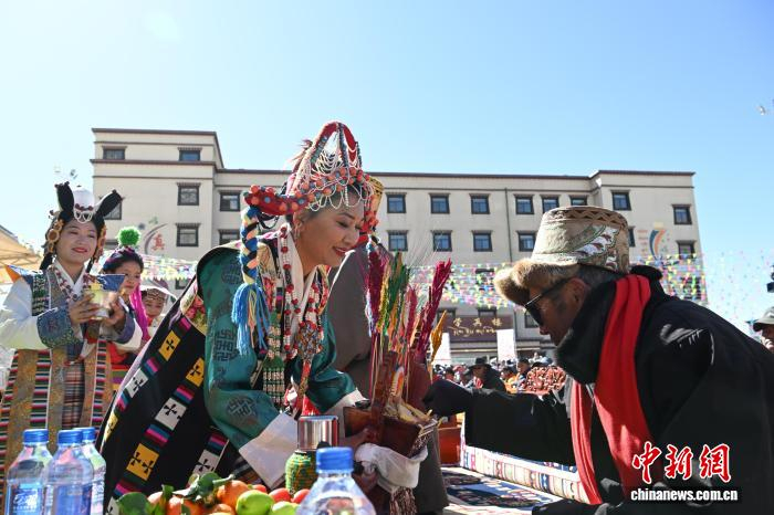 图为羊湖民间艺术团演员表演舞蹈《嘎拉村的欢笑》。中新社记者 贡嘎来松 摄