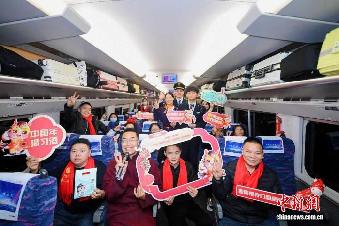 2月5日,广州南站开往贵阳北的D1854次列车上举行了一场别开生面的新春联欢会。陈海洋 摄精彩纷呈的成语接龙、奇幻的魔术表演、喜气洋洋的民歌独唱、逗趣幽默的相声……节目接连上演,旅客们拍手叫好,车厢内的年味也越来越浓。旅客们还自发拿起“我们回家啦”等手举牌打卡合影,活动在阵阵欢笑中落幕。在后续的旅程中,陈海洋还为旅客提供了出站咨询等服务。