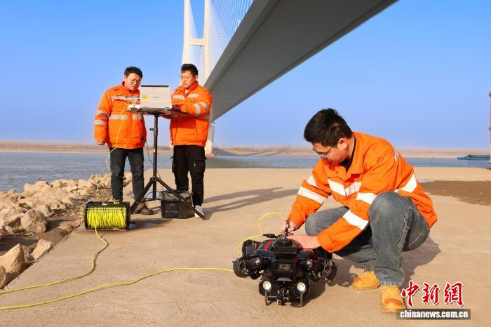 图为中国铁路南昌局集团有限公司九江桥工段鳊鱼洲长江大桥车间桥梁工调试水下机器人。黄钟滨 摄春运期间,这座大桥每日通行高铁列车近百列。如今,无人机、无人船、拉索机器人等高科技检测仪器也运用到了高铁大桥的日常检测当中。