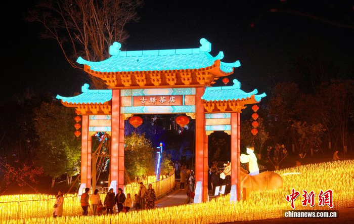 2月6日晚,第55届成都国际熊猫灯会在成都市龙泉驿区东安湖溪峰岛正式亮灯。本届灯会以“川灯耀世界·梦幻东安湖”为主题,围绕国宝、蜀道、三国、诗词、驿马、客家等四川特色文化元素,通过40余组彩灯,在330余亩的溪峰岛上呈现“五区一心”赏灯带——“川灯开新篇”“锦城烟火盛”“蜀道马蹄疾”“古驿桃花香”“兴旺幸福年”和“溪峰之巅”,并创新开展IP联创、场景融合、演艺互动等方式,融入“蓉城囍事”“少必入川”“清廉蓉城”等品牌元素,打造一个可观、可游、可感、可消费的沉浸式彩灯世界。图为“稻花香里说丰年”灯组吸引游客参观。中新社记者 安源 摄