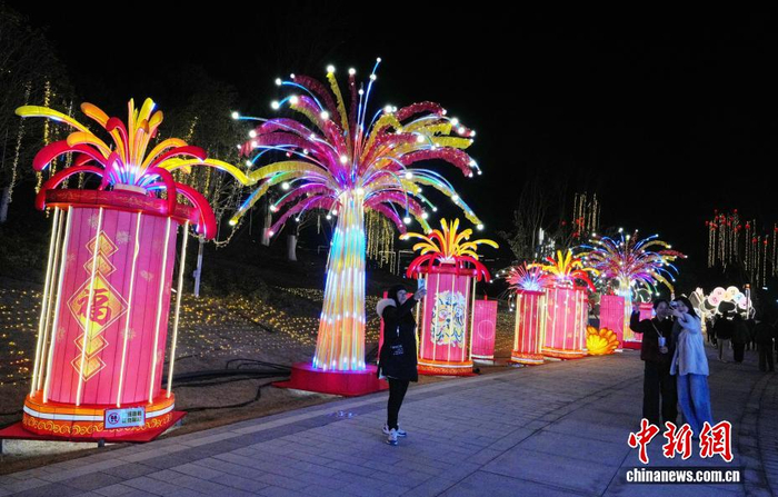 2月6日晚,第55届成都国际熊猫灯会在成都市龙泉驿区东安湖溪峰岛正式亮灯。本届灯会以“川灯耀世界·梦幻东安湖”为主题,围绕国宝、蜀道、三国、诗词、驿马、客家等四川特色文化元素,通过40余组彩灯,在330余亩的溪峰岛上呈现“五区一心”赏灯带——“川灯开新篇”“锦城烟火盛”“蜀道马蹄疾”“古驿桃花香”“兴旺幸福年”和“溪峰之巅”,并创新开展IP联创、场景融合、演艺互动等方式,融入“蓉城囍事”“少必入川”“清廉蓉城”等品牌元素,打造一个可观、可游、可感、可消费的沉浸式彩灯世界。图为“锦城烟火·灿若烟花”灯组吸引游客参观。中新社记者 安源 摄
