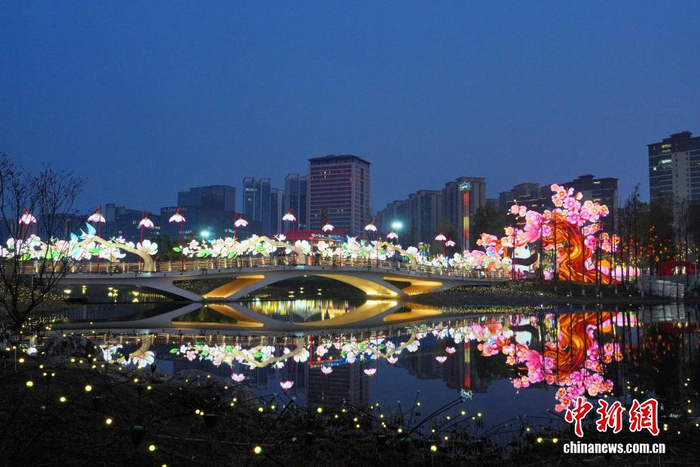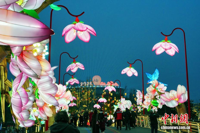 2月6日晚,第55届成都国际熊猫灯会在成都市龙泉驿区东安湖溪峰岛正式亮灯。本届灯会以“川灯耀世界·梦幻东安湖”为主题,围绕国宝、蜀道、三国、诗词、驿马、客家等四川特色文化元素,通过40余组彩灯,在330余亩的溪峰岛上呈现“五区一心”赏灯带——“川灯开新篇”“锦城烟火盛”“蜀道马蹄疾”“古驿桃花香”“兴旺幸福年”和“溪峰之巅”,并创新开展IP联创、场景融合、演艺互动等方式,融入“蓉城囍事”“少必入川”“清廉蓉城”等品牌元素,打造一个可观、可游、可感、可消费的沉浸式彩灯世界。图为“花径逢春恰似锦”灯组吸引游客参观。中新社记者 安源 摄