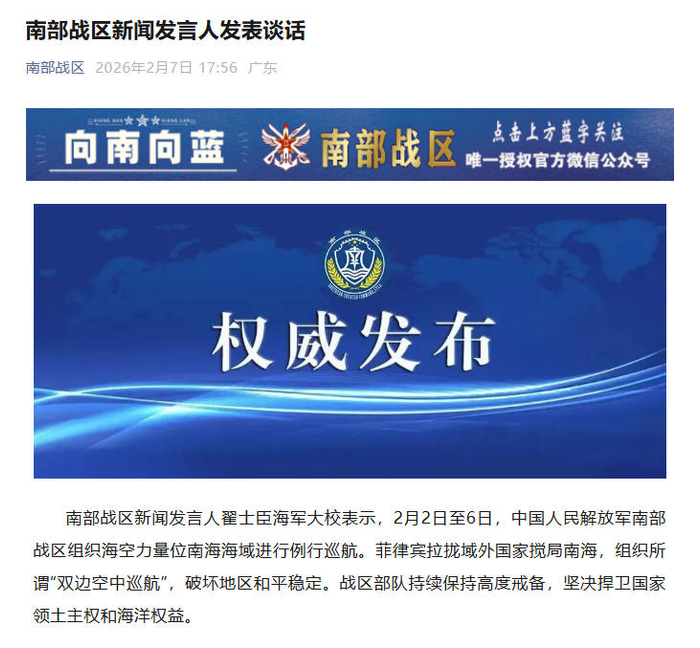 中新网2月7日电 据“南部战区”微信公众号消息,南部战区新闻发言人翟士臣海军大校表示,2月2日至6日,中国人民解放军南部战区组织海空力量位南海海域进行例行巡航。菲律宾拉拢域外国家搅局南海,组织所谓“双边空中巡航”,破坏地区和平稳定。战区部队持续保持高度戒备,坚决捍卫国家领土主权和海洋权益。