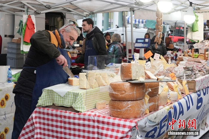 当地时间2月7日,在意大利米兰一周末市集上,店铺员工在切割奶酪。中新社记者 蒋启明 摄