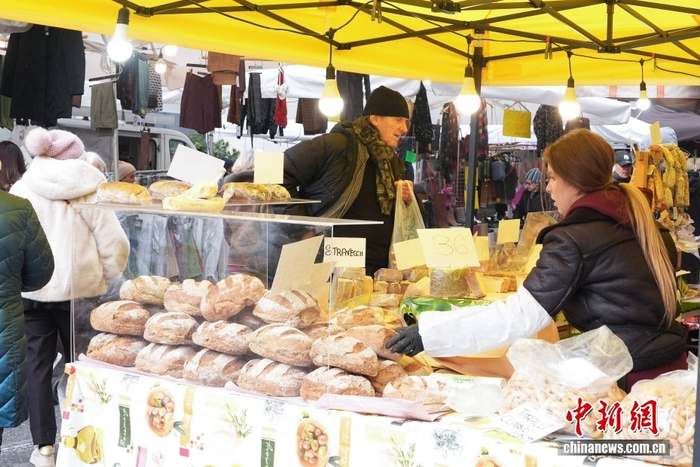 当地时间2月7日,在意大利米兰一周末市集上,顾客购买面包奶酪等食品。中新社记者 蒋启明 摄
