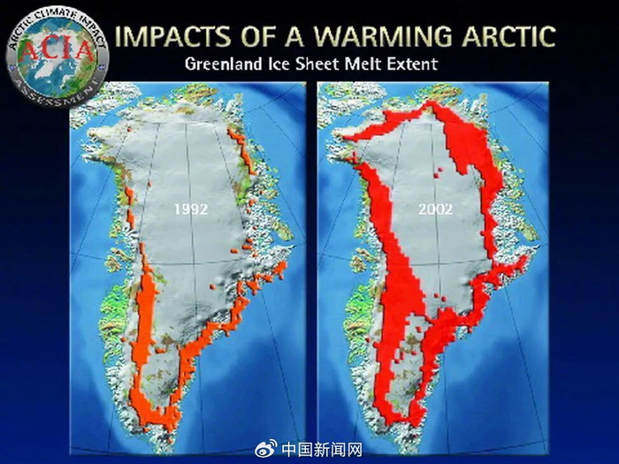 美国哈佛大学教授罗伯特·克瑞尔提供的格陵兰岛地图与1992-2002岛上积冰变化图。(资料图)中新社记者 纳家骅 翻拍