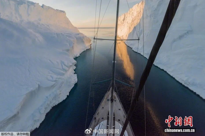 帆船行驶在格陵兰东部斯科斯比峡湾米尔恩岛附近冰川崩解形成的冰山之间。