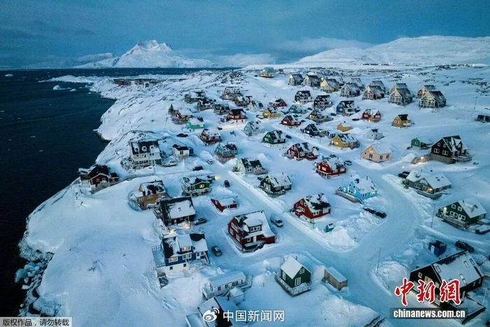 格陵兰岛努克一处海湾沿岸,白雪覆盖了房屋。