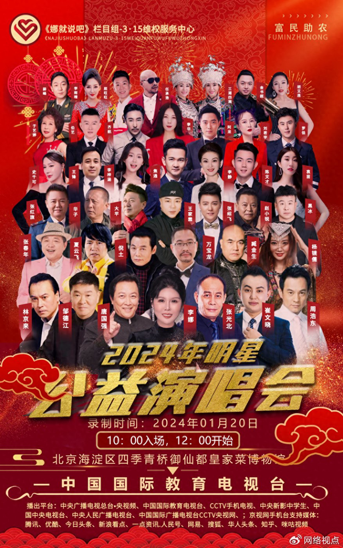 (2024年1月20日 李娜 凌利平 北京)龙年北京迎来了来自全国过各地300多名奋斗在各领域的基层战线的先进工作者、国内娱乐影视战线上各路明星和百名爱心企业家、嘉宾,大家汇聚一堂,响应国家2024富民助农的政策,举办了2024《娜就说吧》315维权富民助农群星公益演唱会!