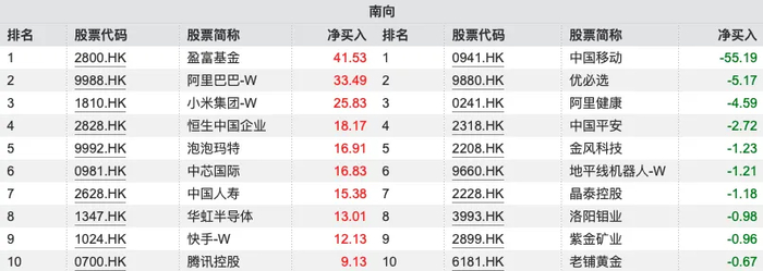 周五,南向资金净流出约16.01亿港元,其中沪港股通净流出约5.6亿港元,深港股通净流出约10.41亿港元。