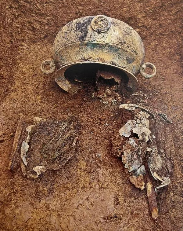 铜釜套头情况(赫章可乐273号墓)这是夜郎文化特有的葬俗,人们会用铜釜、铁釜或铜鼓套于死者头部下葬,部分墓葬足部也套有器物。这件釜的口沿处还保留有套头及发钗的痕迹。