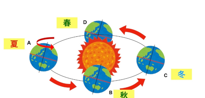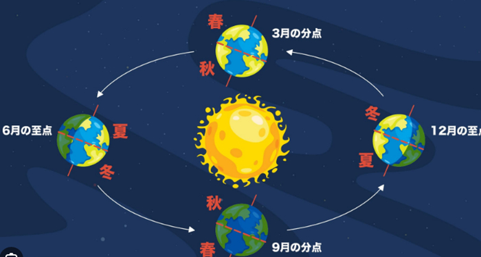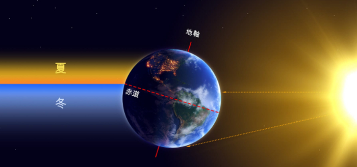 尽管赤道倾斜角不会变化,但是,太阳向对于地球的倾斜角度会不断变化。因此,当地球的其中一个半球朝向太阳时,日照的时间会变长、我们会经历春天和夏天。当这个半球远离太阳倾斜时,会变冷,我们就会经历秋天和冬天。