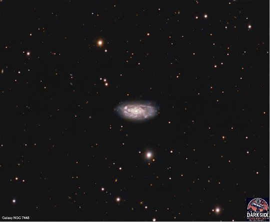 NGC7448是一个位于猎户座的螺旋星系,远离银河系。它属于一个小型星系团,其螺旋结构经常显示出细微的扭曲,这暗示它可能受到附近星系的引力相互作用的影响。像许多螺旋星系一样,NGC7448在其臂部有气体和尘埃云,这些地方可以形成新的恒星,而其中心区域则由较老的恒星主导。尽管它不是最著名的NGC对象之一,但NGC7448对天文学家和天体摄影家来说仍然很感兴趣,因为它的结构提供了有关星系如何随时间通过相互作用而演变和变化的线索。这个星系还被列入Arp目录中的ARP13。