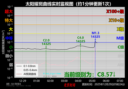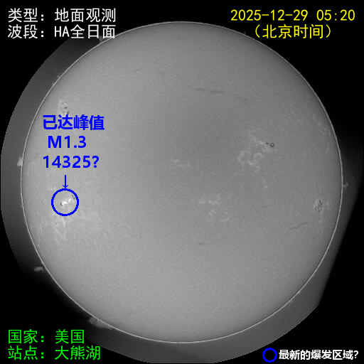 太阳黑子群14325??*在北京时间05时13分爆发了一个中等太阳耀斑事件,其最大值为M1.3级。