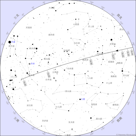 附图1:为银川地区今晚(01月01日)预报的天区图,箭头和实线,可以看到该卫星在夜空位置的走向。