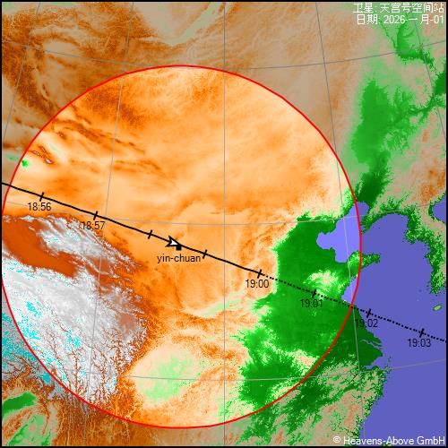 附图2:为银川地区今晚(01月01日)预报的星下点轨迹图,高亮的圆形区域标明了卫星的地平高度至少为10度的范围。此圆形区域的大小取决于卫星的高度。粗略的讲,理论上高亮的圆形区都可以观赏到该卫星。