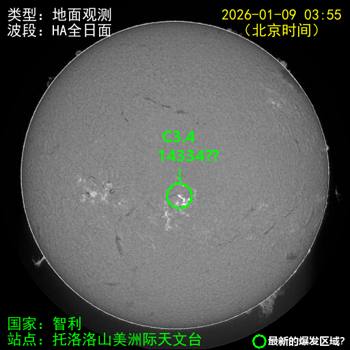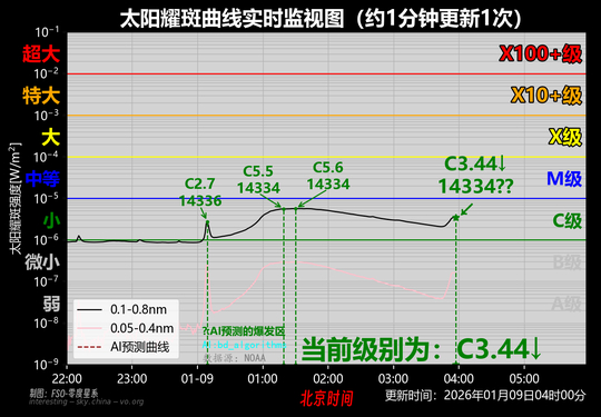 当前【03时56分】级别为C3.4级,小耀斑还在继续上升中,需等待最大值的监测结果…………