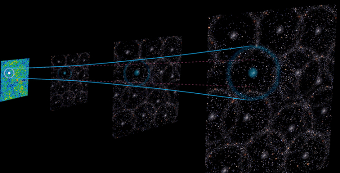 新研究表明,来自宇宙最初时刻的"重子声波振荡(BAOs)"——可以将其想象为"大爆炸的声音"——似乎支持本地空洞或"哈勃气泡"这一概念。