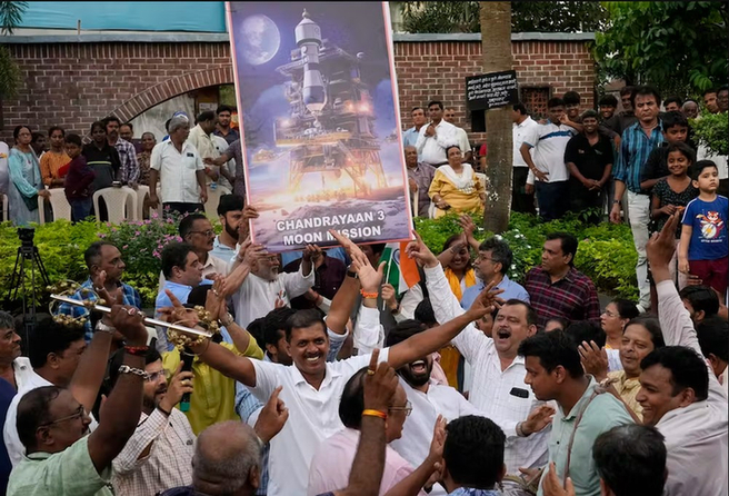 图:印度人民庆祝月船-3号任务器成功着陆月球南极
