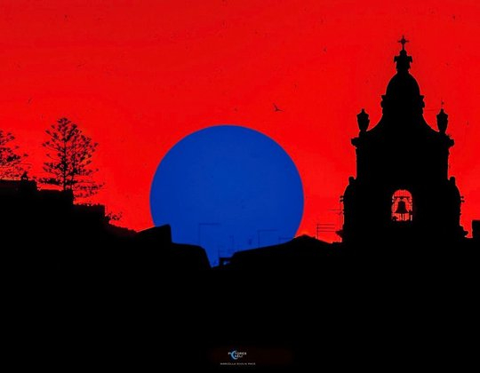 这幅经过滤镜及数位处理的天空影像,是在今年的5月7日摄于地球西西里岛的拉古萨市,主题则是落向教堂钟楼后方的夕阳。在这个特殊版本的影像里,夕阳的色彩看起来格外怪异。不过,名为“余像(afterimage 残像)”的有趣视幻觉,可用来还原这幅影像的部分原本样貌。请进行如下的操作:首先找到蓝色日盘底缘附近的活跃区AR 4079内的太阳黑子。接着,放松并凝视这群暗色的黑子群约30秒,然后闭上眼睛或把视线移到纯白色的区域。很快的,这片日落景观的余像就会浮现。有别于原图,余像会拥有原图的互补色,尤其是正常泛黄的夕阳有蓝天为衬托。
