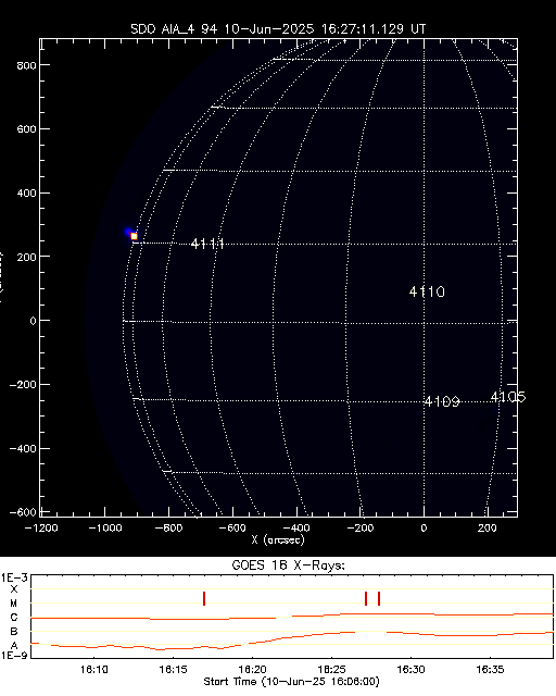 太阳黑子群N16E89在北京时间2025年06月11日00时28分爆发了一个C1.7级小耀斑。