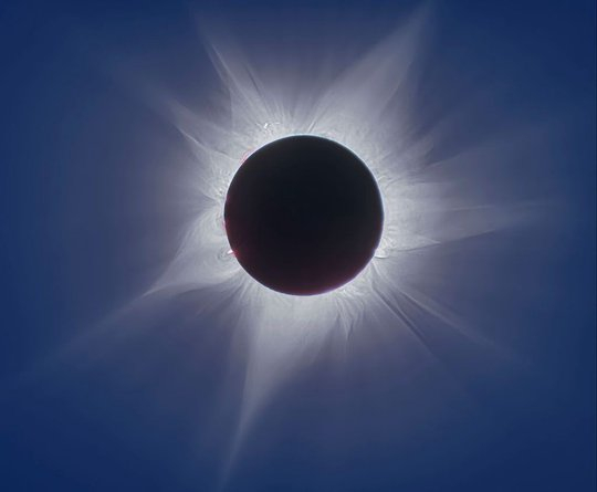 于2023年4月20日,沿着基本上避开陆地的狭窄路径,新月的影子飞掠过地球的南半球,带来了结合日环食与日全食的混合日食。混合日食相当罕见,至于是见到日全食或是有火之环之称的日环食,端视观察者所在的位置而定。譬如这例众所引颈期盼的混合日食,在邻近西澳大利亚海岸的印度洋上,搭乘锭泊于全食路径中心线附近船只的追日食者,就目睹了日全食。这张由著名的追日食者艾斯潘纳克(Fred Espenak)摄于船上的日食影像,捕捉到活跃太阳的壮丽外层大气(日冕)向太空泛流的景象。这幅主题影像,组合自摄于62秒日全食期间、曝光时间介于1/2000秒到1/2秒之间的11张照片,以记录全食阶段肉眼难以见到的日冕细微结构。