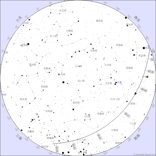 今晚20点38分37秒到20点44分06秒之间,如果您所在地天气晴朗少云,那么不防在这个时段仰望夜空,静等几分钟,您就会看见天宫号空间站(中国空间站)在夜空中移动【其最亮在20点41分,夜空位置为:西南】,天宫号空间站(中国空间站)的样子犹如夜空中一颗明亮的星星在缓慢移动(直接以肉眼就可以看见,不需要望远镜)。您肯定以前在夜空中发现过一颗星星在缓慢移动,不像飞机,不像夜光风筝,那么您的脑海第一想到的肯定是UFO(不明飞行物)吧?!请记住这是我们人类的人造卫星天宫号空间站(中国空间站),在距离我们头顶上空[远地点高度:394 km+近地点高度:388 km]的高处环绕地球。