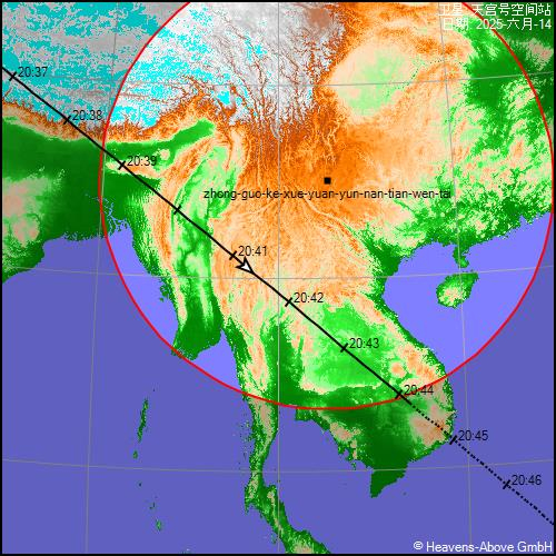 【今晚20250614中国科学院云南天文台地区肉眼可赏天宫号空间站(中国空间站)】