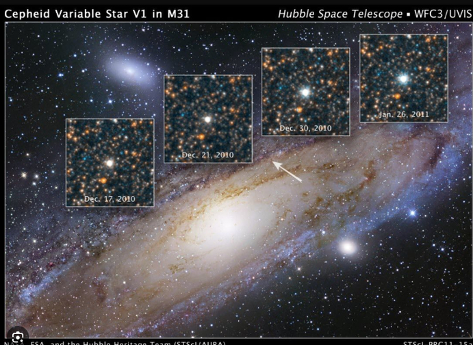里奇说:“哈勃对这张照片非常兴奋,他在黑白玻璃底片上写下了‘VAR(变星)!’,因为他看到了一颗造父变星存在的证据。”那颗造父变星后来被简称为“V1”。哈勃更明白,海蒂娜·莱维特和哈洛·沙普利所做的研究,这只意味着他首次挑战就够测量出一个螺旋星云的距离。”