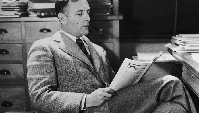 大约1945年:天文学家埃德温·鲍威尔·哈勃博士坐在桌子前的椅子上看杂志。作为威尔逊山天文台的一名工作人员,他是第一个提出论点支持宇宙膨胀理论的科学家,该理论现在被称为哈勃定律。(图片来源:《纽约时报》/盖蒂图片社)