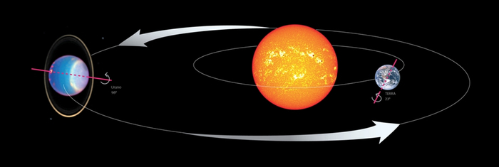 天王星和地球的自转轴角度差异,可以看出天王星几乎是“躺着”围绕太阳运转的(图片来自网络)