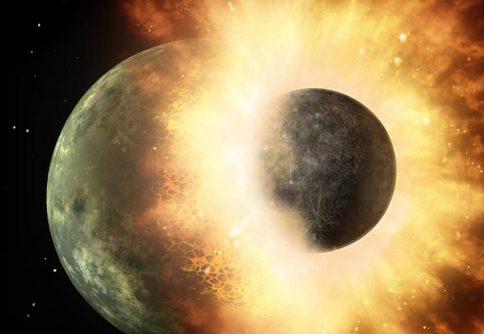 即使在今天,行星依然在不断遭受撞击,只不过大部分都属于小型撞击,虽然碰撞能量很大,最终也只是在行星表面留下一个陨石坑。而大型碰撞事件虽然更罕见,其释放能量却远大于一般的碰撞,这种碰撞发生在两颗相近质量的行星之间。这种碰撞将彻底的重新塑造行星,改变其命运,甚至影响行星的宜居性。