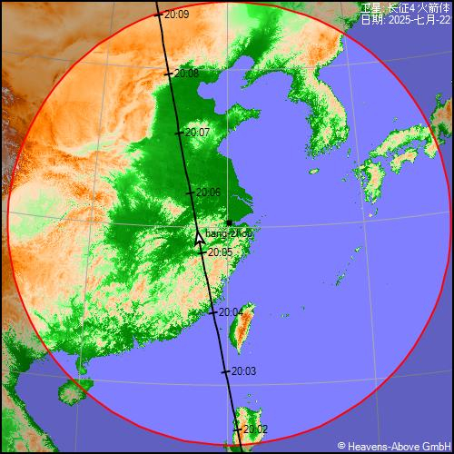 附图2:为杭州地区今晚(07月22日)预报的星下点轨迹图,高亮的圆形区域标明了卫星的地平高度至少为10度的范围。此圆形区域的大小取决于卫星的高度。粗略的讲,理论上高亮的圆形区都可以观赏到该卫星。