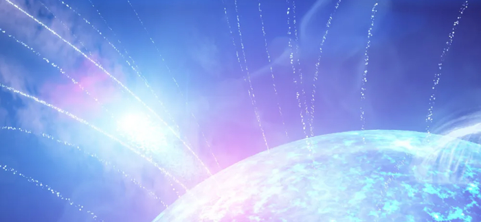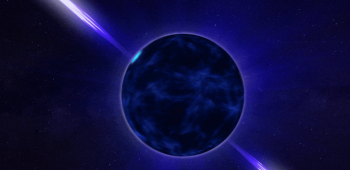 一幅插图显示一颗中子星“闪烁”,释放出一股无线电波辐射。