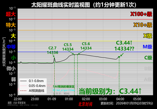 当前【03时54分】级别为C3.3级,小耀斑还在继续上升中,需等待最大值的监测结果…………
